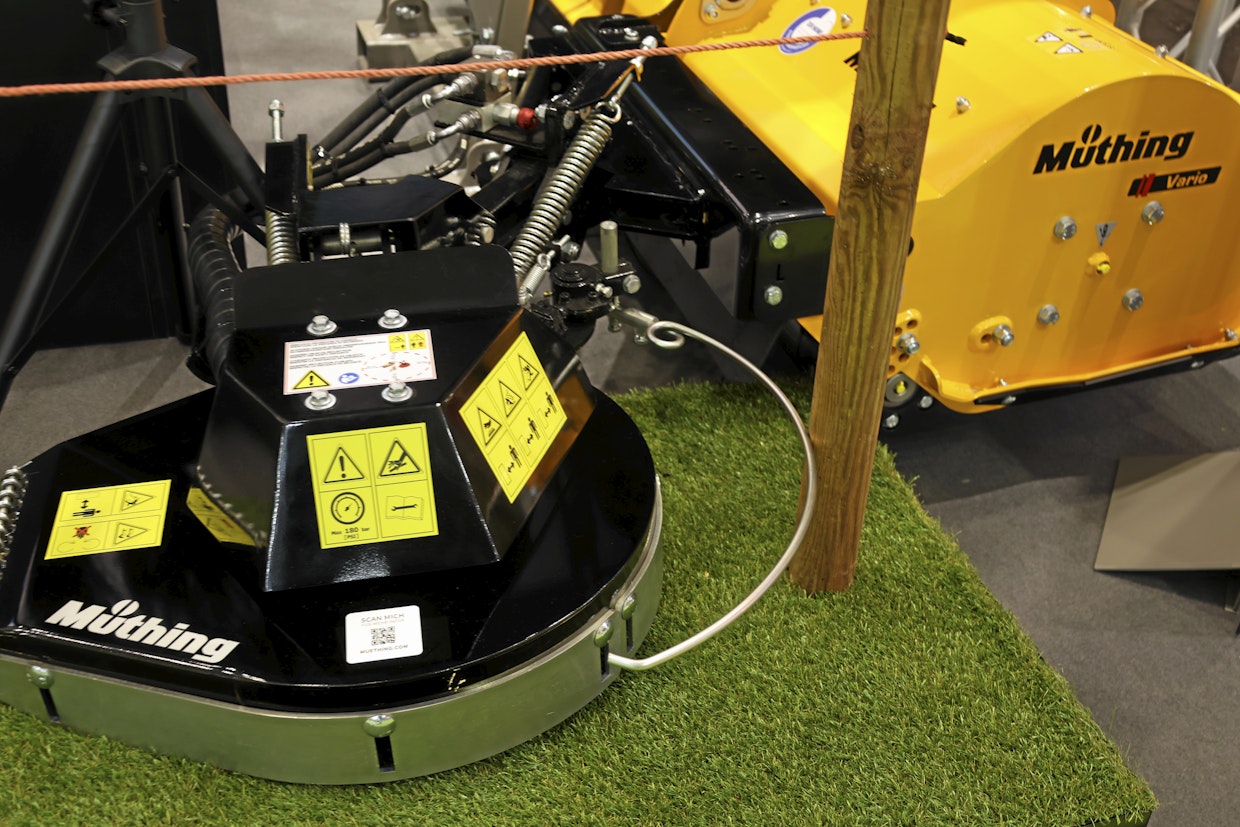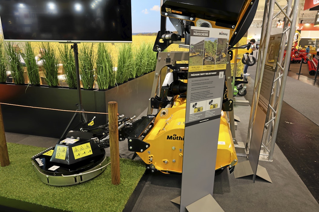 Müthingin uutuus on niittoyksikkö, joka kytketään perinteiseen rumpumurskaan, ja samalla saadaan niitettyä heinät tolppien tai puiden tyviltä. Terää pyöritetään hydrauliikalla. Tuoton tarve on vähintään 30 litraa minuutissa. Kuva: Seppo PenttiMoniin Müthingin murskaimiin voidaan lisätä runkosovitteella varustettu lisävaruste, sivuniittoyksikkö, jolla niitetään tolppien ympäristöt kotieläintiloilla ja runkojen ympäristöt esimerkiksi omenatarhoilla. Niitto pitää tehdä molemmin puolin estettä, koska laitteella ei päästä kokonaan kiertämään estettä.