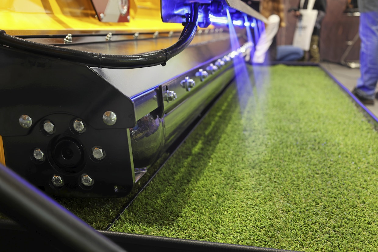 Leikkuri väistää kierrettävää estettä anturin antaman tiedon perusteella joko hydraulisesti tai jousikuormitteisesti. Hydraulinen järjestelmä on painavampi kuin jousikuormitteinen Kuva: Seppo PenttiMüthingin toinen uutuus on murskaimen taakse laitettava levitysramppi nesteille. Yksi tärkeä tehtävä rampilla on erilaisten biostimulanttien levittäminen samaan aikaan, kun murskataan kasvustoa. Kun levitys voidaan tehdä samaan aikaan niiton kanssa, säästyy työvaiheita. Ramppi on Müthingin valmistama ja se voidaan asentaa myös jälkikäteen itse. Ramppeja on saatavilla eri levyisenä.