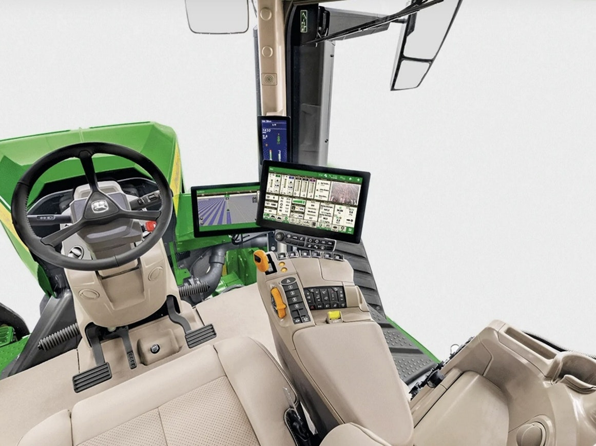 The cab was called CommandView 4 Plus and was larger in size and glass area than before. The mechanical cab suspension was upgraded with three-level adjustability. Steering effort and steering ratio were adjusted according to driving speed, improving comfort in the field and drivability on the road. The cab came standard with a 12.8” display, instrument cluster on the A-pillar, and JD Precision Ag integration, such as adjustable application rates and optional section control.