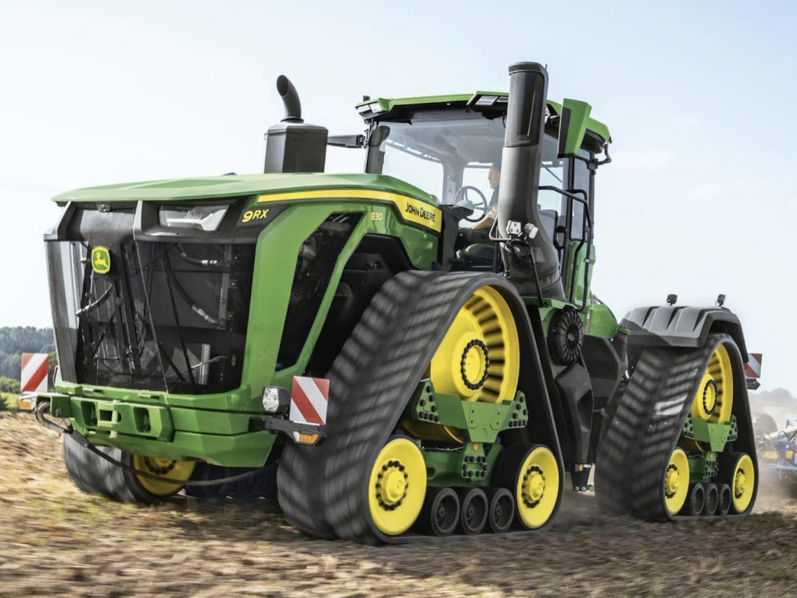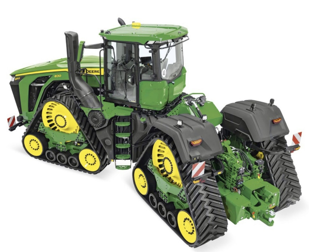 At the beginning of 2024, John Deere introduced the most powerful series-production tractor on the market. The new 9RX 710, 770, and 830 models differed in many ways from the smaller 9RX models. Common features included four tracks, but the drive wheels were increased by 20 cm to 1.2 meters. The ground contact pressure (0.58 kg/cm²) was comparable to that of the smaller 9RX models.