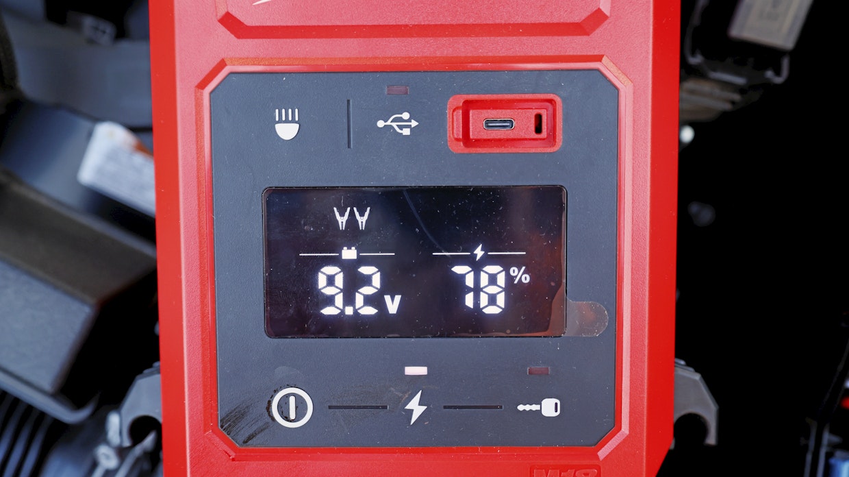 Näytöltä näkee käynnistettävän ajoneuvon akun jännitteen, kondensaattoreiden varaustason ja perusakun varauksen. Ennen lisävirran antamista on odotettava, että kondensaattorit latautuvat. Varustuksena on myös USB C -latausliitäntä. Kuva: Arto Turpeinen