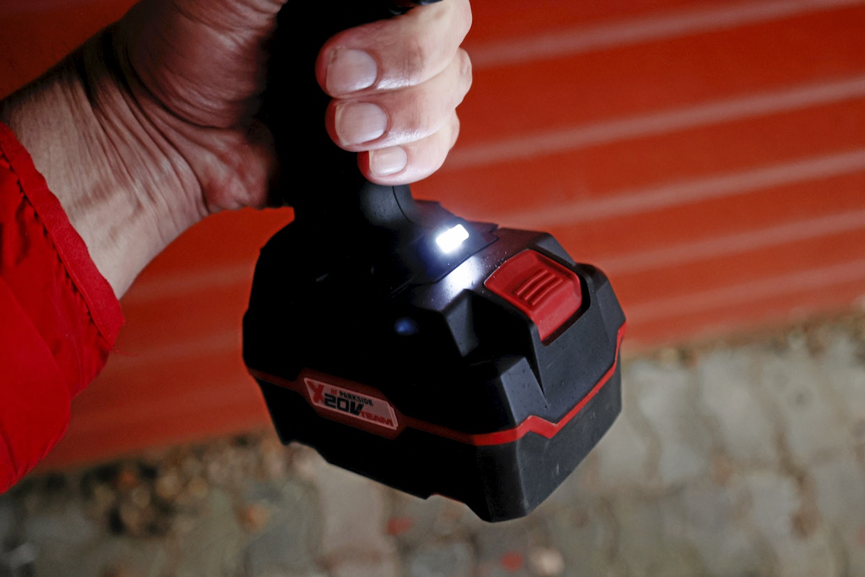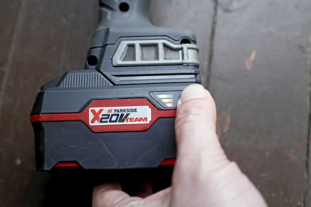 Saatavilla on ainoastaan yksi 20 V:n ja 4 Ah:n akkumalli, joka sopii myös muihin Parkside X 20V Team -sarjan laitteisiin. Varauksen voi tarkistaa akun sivusta nappia painamalla. Kuva: Arto TurpeinenEnsivaikutelma laadukas