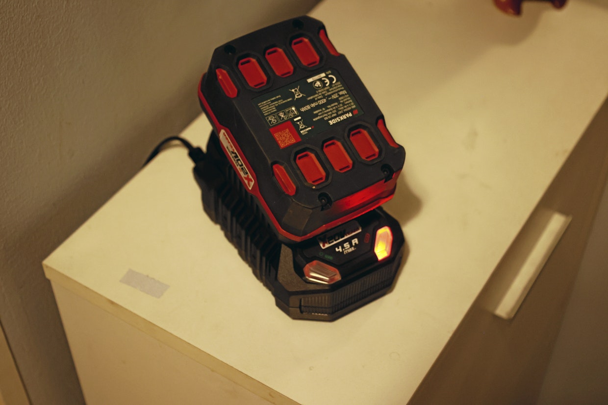 Laturi maksaa ainoastaan 14,99 euroa, ja sillä voi ladata kaikkien sarjan laitteiden akkuja. Latausvirta on 4,5 A. Kuva: Arto TurpeinenHinnalla tuotteita ei ole pilattu. Akun hinta on 39,99 € ja laturin 14,99 €. Kulmahiomakoneen hinnaksi ilmoitetaan 39,99 € ja porakoneen 34,99 €.