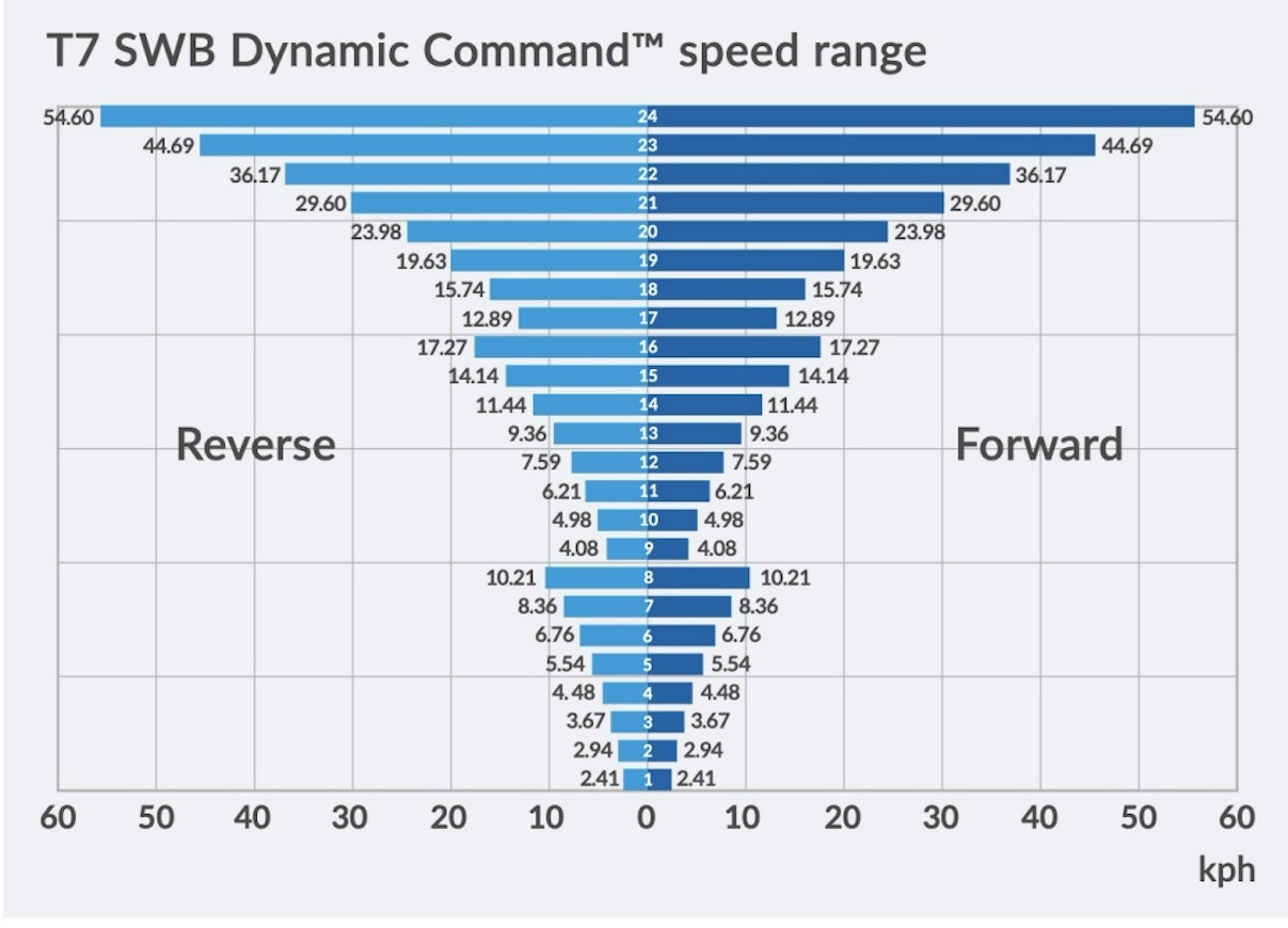 Toinen vaihtoehto oli uusi 24+24 Dynamic Command -kaksoiskytkinvaihteisto. Huippunopeudeksi ilmoitettiin 54,6 km/h. Myöhemmin luvattiin vielä perusversioksi osapowershift Range Commandia kolmeen pienimpään malliin.