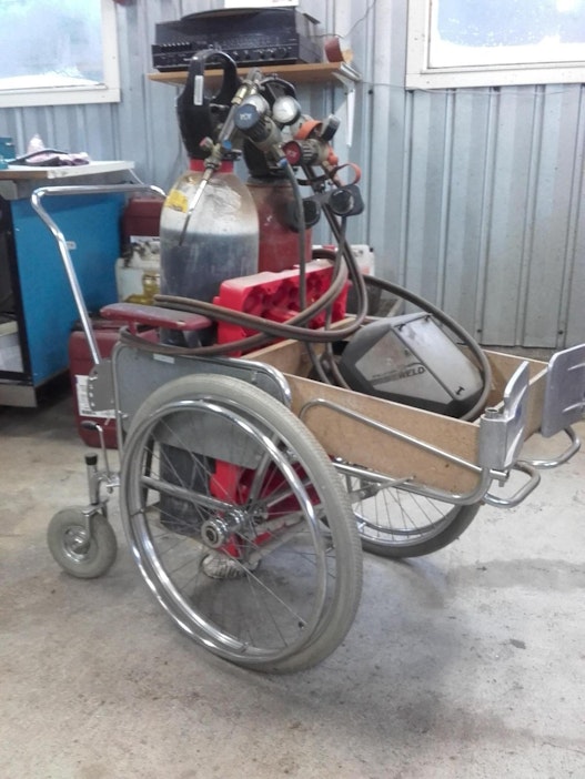 Forssalaisen Matti Holmbergin kaasupullot kulkevat työskentelykohteeseen varsin kevyesti vanhassa pyörätuolissa.