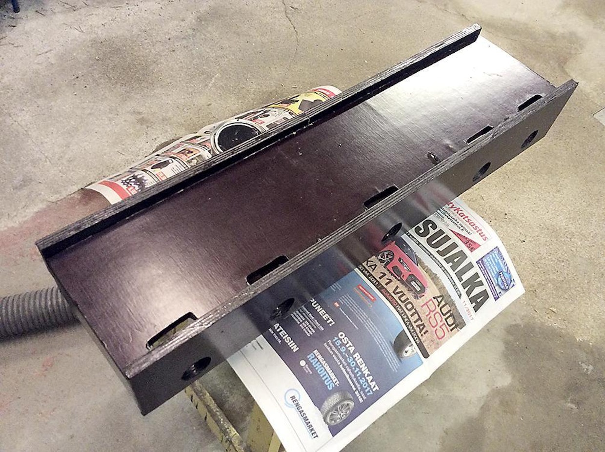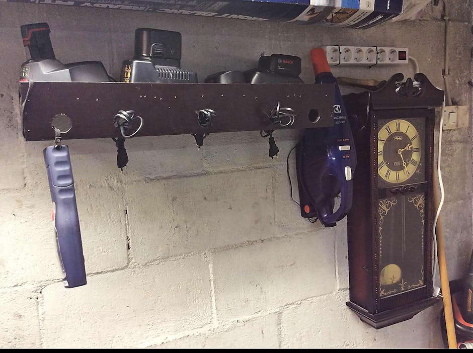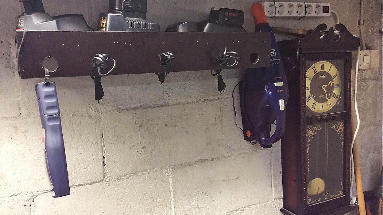 Akkukäyttöisten työkalujen latureissa on usein harmittavan lyhyet johdot. Työpöytä pistokkeen lähellä täyttyy helposti latureista, kun jokainen työkalumerkki tarvitsee omansa.Sami Heinonen Hämeenlinnasta ratkaisi ongelman kuvassa olevalla lataushyllyllä. Filmivanerista tehty hylly on hallin seinällä, silmän korkeudella ja lähellä ulko-ovea. Hyllyn päädyt ovat auki, jotta pölyt ja roskat saa helposti pois. Pistorasian voisi laittaa hyllyn allekin. Hyllyssä akut latautuvat ilmavasti ja reissuhommiin on helppo napata laturi akkuineen koneen laukkuun mukaan.