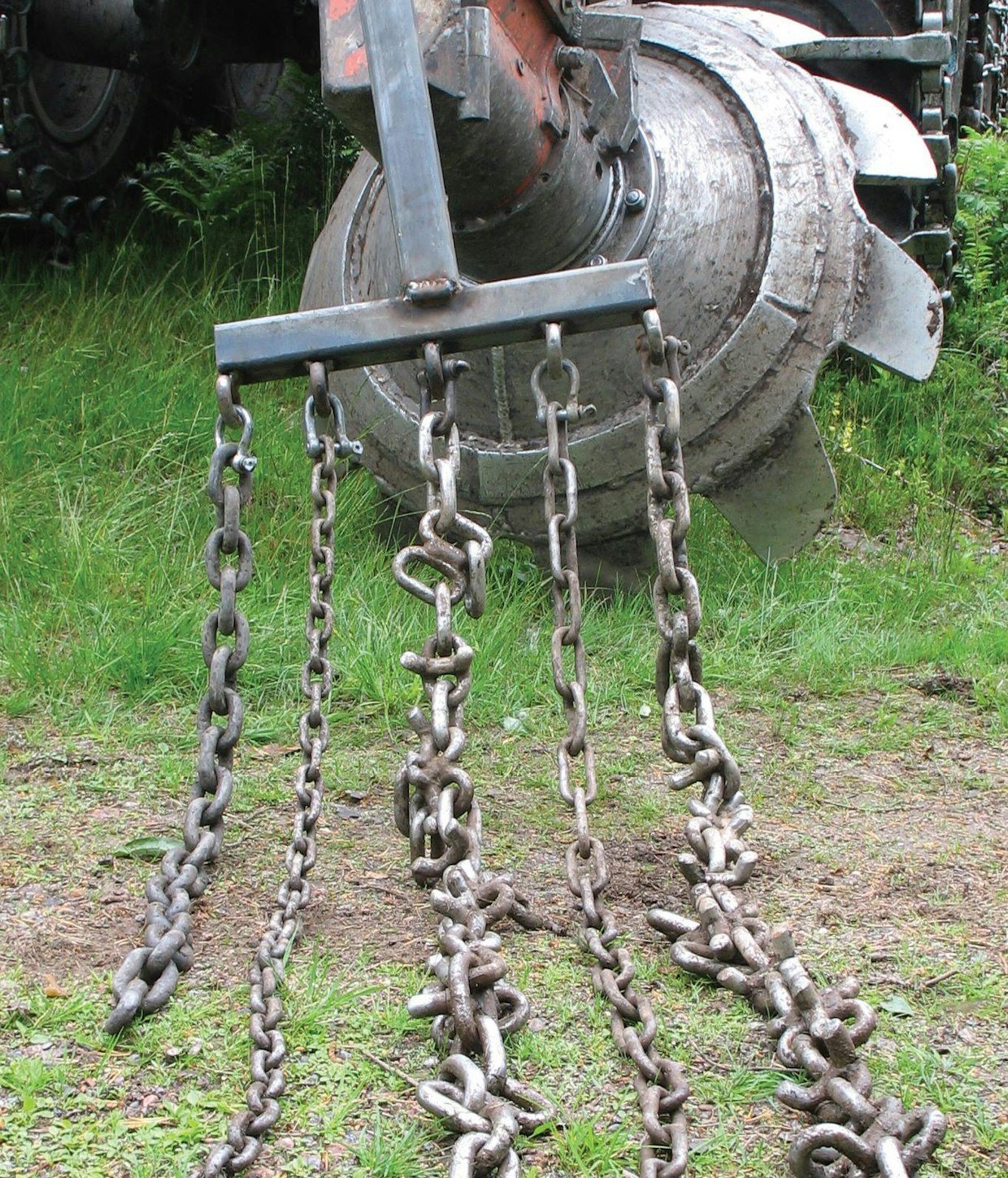 Metsä-äkeeseen kiinnitetty ketjulaahus, jolla pyrittiin tasoittamaan äesjäljen korkeusvaihtelua ja peittämään siemenet. Kylvölaitteen siemensuutin on äkeen lautasen tyvellä. Kuva: Kyösti Sipilä