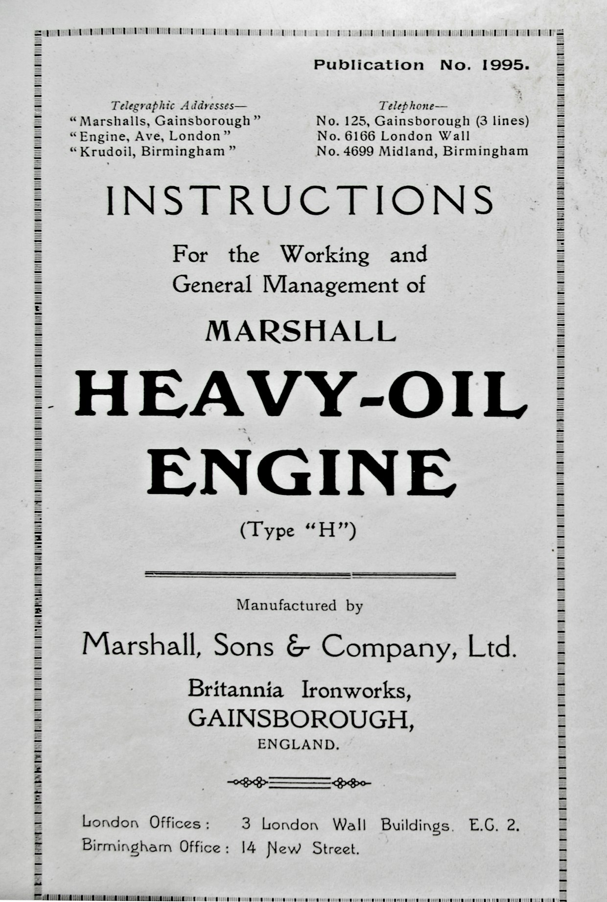 Hankittu moottori oli aikansa moderneinta tekniikkaa edustanut diesel-periaatteella toimiva englantilainen Marshall. Yksisylinterisen koneen iskutilavuus on 42,6 litraa. Kun Marshall-moottoria vertaa tuon ajan tavanomaisiin paikallishöyrykoneisiin, investointi on täytynyt olla huomattavan kallis. Moottori pyöritti siihen kytkettyä 380 V / 55 kW:n AEG-generaattoria.