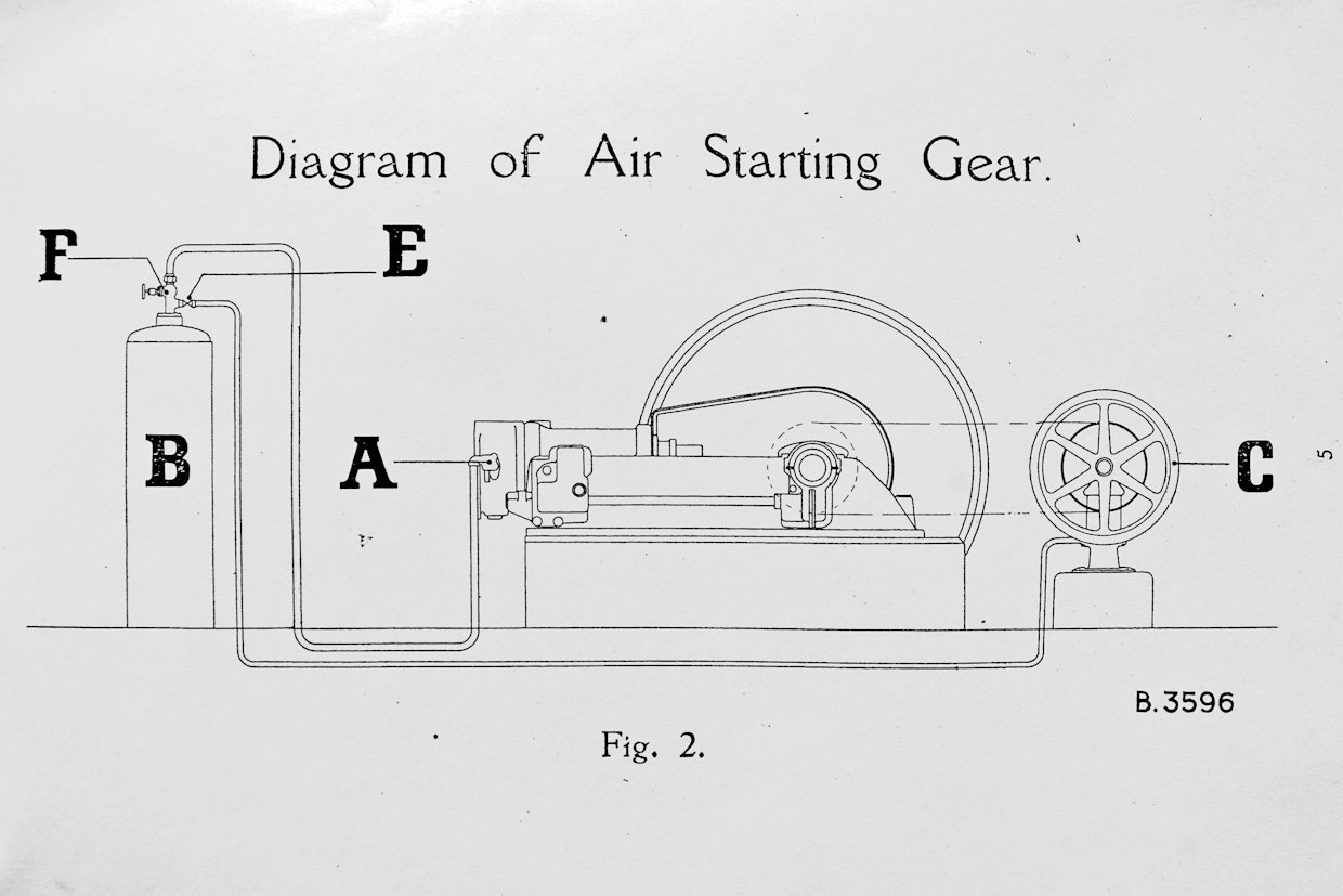 Käyttöohjekirjassa on paineilmakäynnistyksen kaaviopiirros. Merkinnät: A. Yhteys sylinteriin, B. Ilmasäiliö, C. Ilmapumppu, E. Liitos ilmasäiliöön, F. Venttiili.Rakennuksesta löytyi siivottaessa tynnyrillinen dieseliä, joka oli täytetty aivan piripintaan. "Epäiltiin, että onko se enää syttyvää. Otin sitä rättiin ja menin pihalle. Sytytin sytkärillä ja sehän paloi ihan kunnolla. Se sitten käytettiin moottorin polttoaineena", Pertti kertoo.