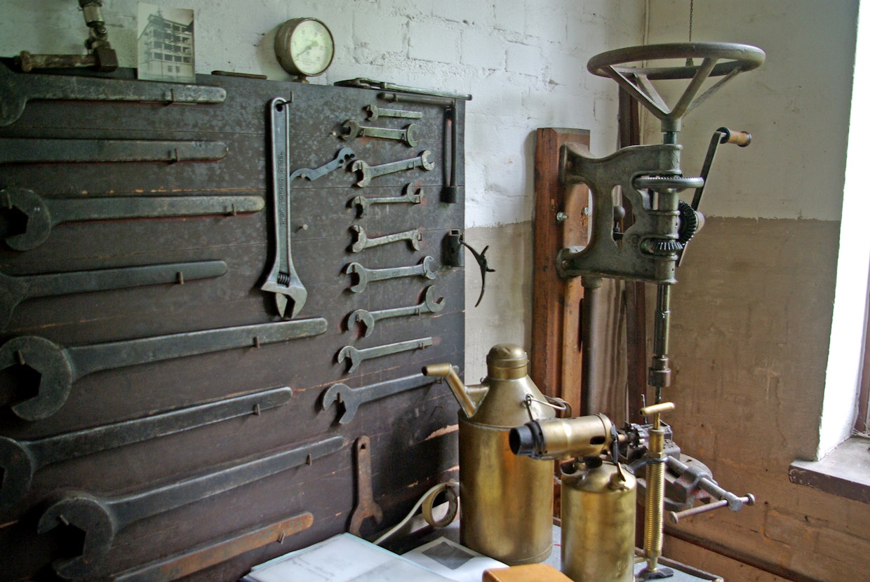 On ihmeellistä, että jopa alkuperäiset työkalut olivat säilyneet rakennuksen seinällä. Mitään ei oltu rikottu tai viety. Rakennuksessa oli täysi tynnyri moottoriöljyä 1950-luvulta. Se oli pysynyt hyvänä ja sitä on käytetty moottorissa voiteluöljynä. Kuva: Heikki HaapakoskiHiltunen oli kiinnostunut kuulemastaan niin paljon, että lähti myöhemmin vuosituhannen vaihteen jälkeen etsimään kyseistä konetta. Etsintä ei aluksi tuottanut mitään tulosta. Lopulta erään punatiilisen rakennuksen kohdalla häntä onnisti: vanereilla peitettyjen ikkunoiden raosta näkyi valtava vauhtipyörä. Moottori oli löytynyt.