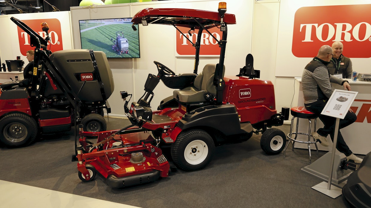Toro E3200e on merkin akkukäyttöinen vaakatasoleikkuri. Koneessa on valinnan mukaan 11–17 HyperCell-litiumioniakkua. Järjestelmän jännite on 60 v. Virran luvataan riittävän työpäiväksi. Leikkurissa on sisäänrakennettu 3,3 kW:n laturi. Leikkuupöydän leveys on 152 tai 183 cm. Leikkuupään saa joko sivulle tai taakse purkavaksi. Etuvetoisen leikkurin suuriin siirtonopeus on 20 km/h. Kuva: Arto Turpeinen