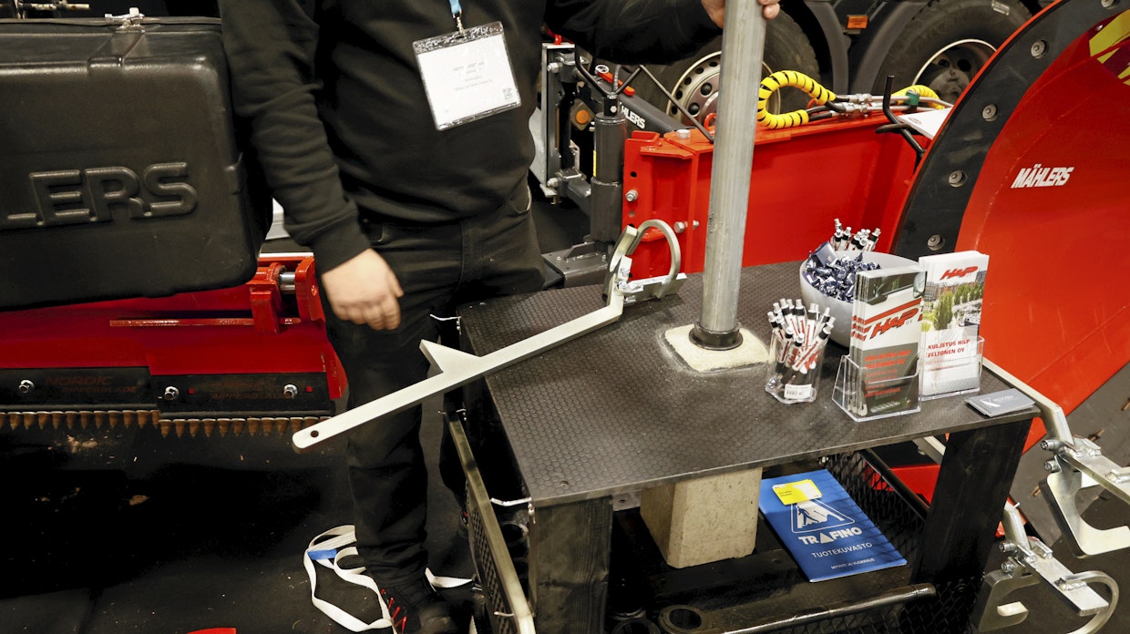 Peltosen Kone ja Metalli Oy on kehittänyt väylävivun liikennemerkkien nostamiseen. Tavoitteena on tehdä irrottamisesta nopeampaa ja ergonomisempaa. Hahlot asennetaan putkenympärille ja putki vivutaan jalkaa tukena käyttäen irti jalustasta. Hinta on 324 euroa (alv 0 %) Kuva: Arto Turpeinen