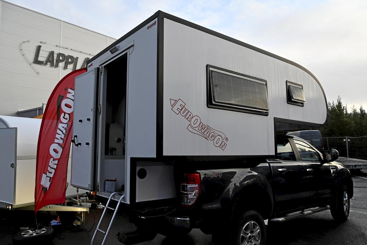 Eurovagon esitteli avolavalle nostettavaa matkailukoria. Koria ei kiinnitetä perinteisesti lavalle, vaan se sidotaan kuormaliinoilla. Näin ollen autolle ei tarvitse tehdä muutoskatsastusta, koska vajaa 300 kg painava kori katsotaan lastiksi. Kuva: Seppo NykänenArtikkelin aiheet- Osaston luetuimmat
