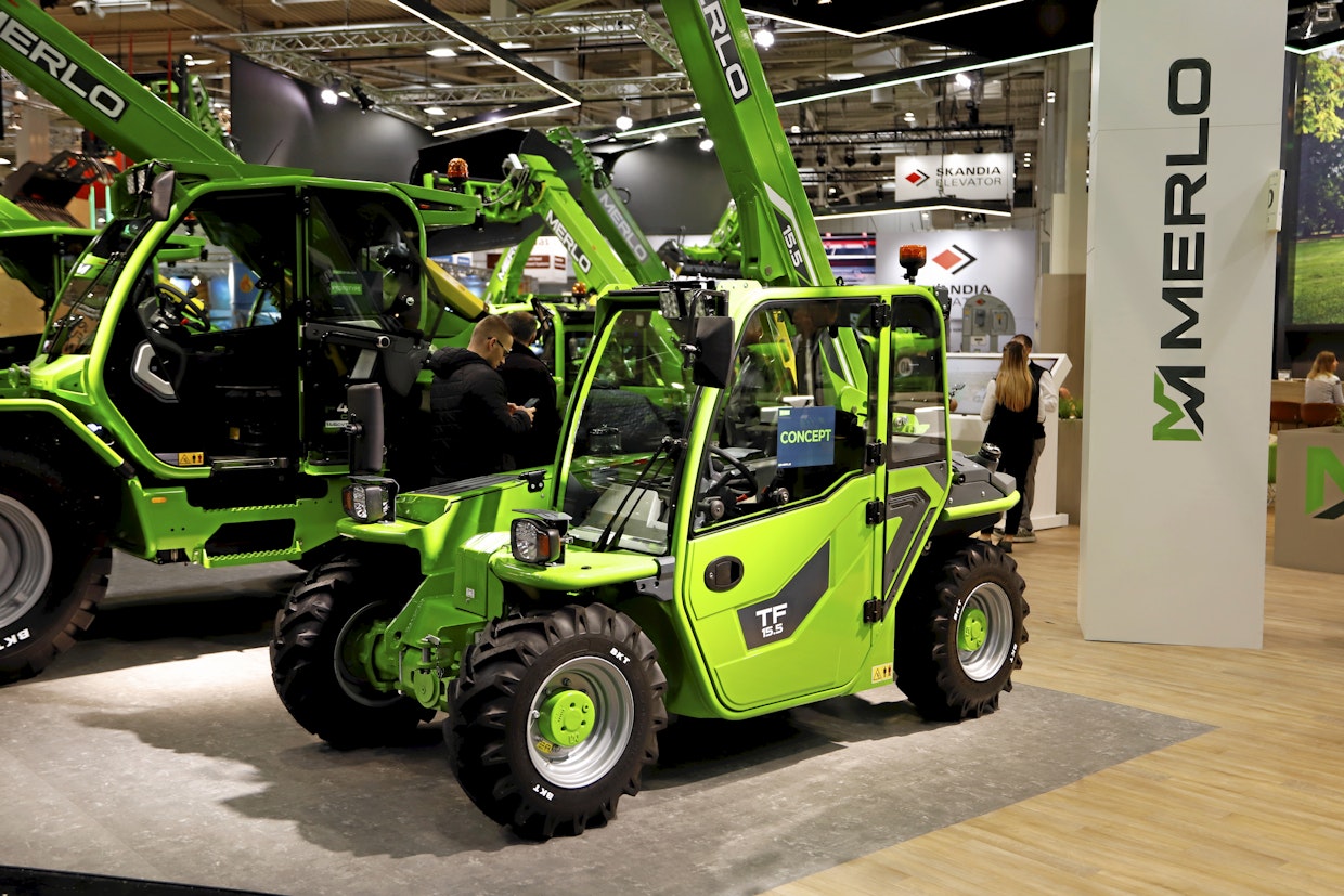 Merlo TF15.5 -konseptimalli tulisi pystyä siirtämään kevyellä trailerilla, jolloin suurin hinattava massa jäisi alle 3 500 kg. Tehoa on nyt 35 hv, mutta lisää tarvittaisiin ja painoa tulisi pudottaa, mikä näkyy varustelussa. Keveys, tehovaatimus ja käytettävissä oleva tila on vaikea myös moottorivalmistajan näkökulmasta. Nyt moottorina on Yanmar. Kuva: Eemeli Linna