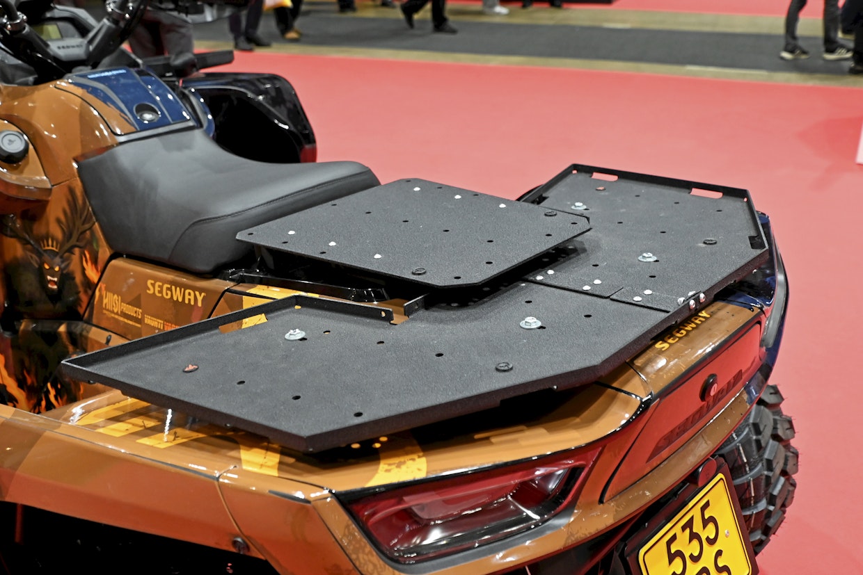 Benda on uusi mönkijämerkki suomen markkinoille, se erottuu kilpailijoista muotoilullaan. Kuva: Seppo NykänenLisävarusteita uutuuspuolella oli vähän. Hiisi Production esitteli Segwayn osastolla metallisia tavaratelineitä. Tukevarakenteiset telineet kestävät työkäytössä kovempaa käsittelyä kuin lähes kaikissa mönkijöissä käytössä olevat komposiittirakenteet.
